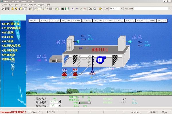 实际当中,在进行智能楼宇个性化的人机交互界面开发和设计时,一般应事先完成以上对应的各项设置和操作,随后则需要进行以下相关操作:首先将智能楼宇控制系统所需的各个控制点下载到操作站(Station)当中,这样就保证了控制点对应的各个参数和数据会及时传送至EBI服务器并保存到相应的数据库中。但实际当中为了便于实时有效的监控智能楼宇系统的各个设备,一般还需要通过专门设计开发个性化的人机交互界面或图形来实现,当然就需要借助和使用EBI系统软件自带的Display Builder软件进行系统的二次开发来实现和完成人机交互的基本功能以及其他特定功能。如图所示即为通过Display Builder开发出来的AHU101对应智能楼宇监控系统的人机交互界面。通过该界面,可实时监控该智能楼宇系统的温度、湿度、压力等各个参数,并进行诸如系统模式转换、风机的变频控制等操作。